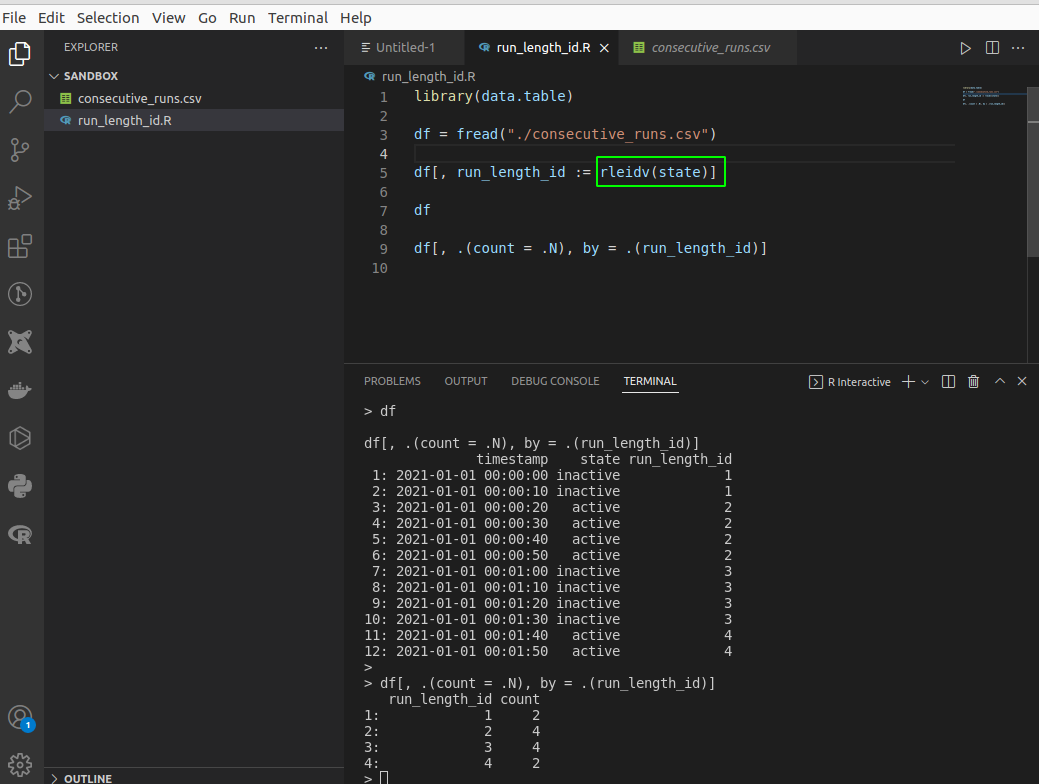 Sometimes during analysis work, you need to group consecutive sequence of values into different “runs”, and calculate metrics for each run. For example: